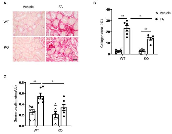 To assess the effect of STAT6 deficiency on kidney fibrosis, kidney sections were stained with Sirius red. Folic-acid-treated WT mice had significant amounts of collagen deposition in the kidney, whereas the collagen deposition in the kidney was markedly lower in folic-acid-treated STAT6 KO mice. These data indicate that STAT6 deficiency ameliorates the pathogenesis of renal fibrosis (Figure 6A,B).