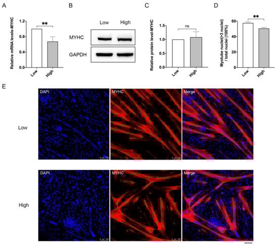 The differentiation capacity of MuSCs under low and high densities. MuSCs were seeded at 2.7 × 103/cm2 (low) and 2.2 × 104/cm2 (high), cells were harvested after three days culture and seeded onto Matrigel-coated dishes at equal densities to differentiate for 5 days. (A) qPCR analysis of MYHC mRNA levels. (B) MYHC protein levels by Western blot. (C) Relative protein levels of MYHC normalized to GAPDH indicated in (B) by Quantity One software. (D) Quantification of the percentage of myotubes with more than three nuclei. (E) Immunofluorescence staining of MYHC (red) and nucleus (blue). Mean ± SD from three independent experiments. Significance was analyzed by Students’ t-test. ** p < 0.01, ns, not significant (p > 0.05).