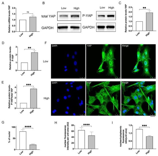 3.2. More YAP Is Phosphorylated and Located in Cytoplasm upon High-Density Culture