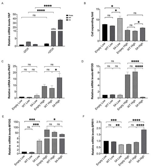Overexpression of constitutively active YAP promotes cell proliferation and stemness maintenance of MuSCs. The 2 μg/mL Dox was used for 48 h to induce the expression of YAP before harvesting. (A) Expression of YAP induced by Dox in control MuSCs transfected with empty vectors and MuSCs transfected by wild-type (WT) YAP and phosphorylation mutational YAP (5A). (B) The cell expanding fold of MuSCs after Dox induction under low and high densities. (C–F) Expression of PAX7, MYOD, MYOG, and SPRY1 under indicated conditions by qPCR analysis. Mean ± SD from three independent experiments. Significance was analyzed by two-way ANOVA for (A) and one-way ANOVA for (B–F). * p < 0.05, ** p < 0.01, *** p < 0.001, **** p < 0.0001, ns, not significant (p > 0.05).