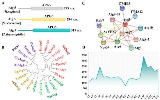 Characterization of Atg5 in Tetrahymena thermophila. (A) Schematic of the functional domain of the autophagy-related protein Atg5. Analysis was performed in the SMART database; (B) Phylogenetic tree of Atg5. Phylogenetic trees were constructed based on the amino acid sequences of APG5 domain from different species. HsAtg5, Homo sapiens Atg5 (AGC52703.1); MmAtg5, Mus musculus Atg5 (NP_444299.1); XlAtg5, Xenopus laevis Atg5 (AAH71093.1); DrAtg5, Danio rerio Atg5 (NP_991181.2); AgAtg5, Anoplophora glabripennis Atg5 (XP_018579453.1); PpAtg5, Photinus pyralis Atg5 (XP_031333397.1); OtAtg5, Onthophagus taurus Atg5 (XP_022904887.1); RhAtg5, Rhipicephalus haemaphysaloides Atg5 (QHA24496.1); T.empidokyrea Atg5, Tetrahymena empidokyrea Atg5 (TEPIDO00117960); T.shanghaiensis Atg5, Tetrahymena shanghaiensis Atg5 (TSHANG00053680); T. elliotti Atg5, Tetrahymena elliotti Atg5 (TELLIO00184010); T. thermophile Atg5, Tetrahymena thermophila Atg5 (XP_001023196.1); PtAtg5, Paramecium tetraurelia Atg5 (XP_001439074.1); PcAtg5, Phytophthora cinnamomi Atg5 (KAG6623658.1); SpAtg5, Schizosaccharomyces pombe Atg5 (NP_596427.1); TmAtg5, Tuber magnatum Atg5 (PWW76226.1); PgAtg5, Pyricularia grisea Atg5 (ABO93146.1); AtAtg5, Arabidopsis thaliana Atg5 (NP_197231.1); GmAtg5, Glycine max Atg5 (CAJ31277.1); ZmAtg5, Zea mays Atg5 (NP_001105827.1); TuAtg5, Triticum urartu Atg5 (EMS63970.1); OsAtg5, Oryza sativa Japonica Group Atg5 (XP_015627449.1); (C) Analysis of potential proteins interacting with Atg5 in T. thermophila using the STRING database. Each node represents a protein; (D) Expression pattern of the ATG5 gene from T. thermophila Functional Genomics Database (http://tfgd.ihb.ac.cn, accessed on 1 November 2021). L, growing cells; S, starvation; C, conjugation.