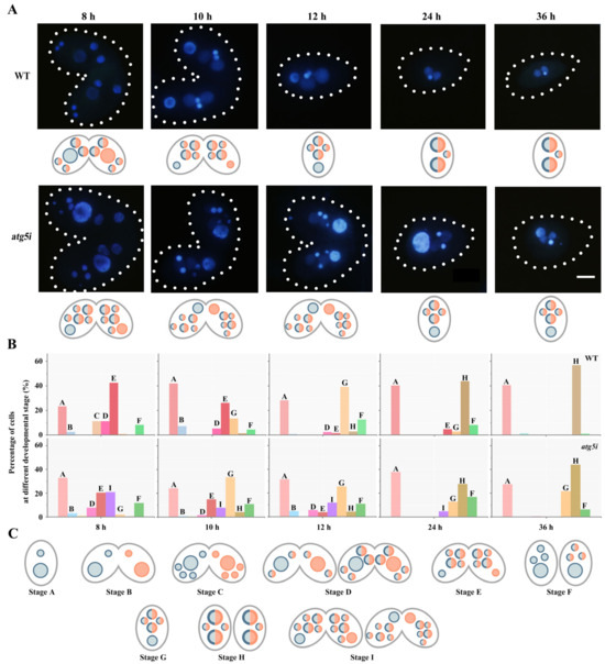 To observe the localization patterns of HA-Atg5 and HA-Atg8, cells were treated as previously described [36]. Mating cells were fixed overnight with 5 mL of Lavdowsky’s fixative (ethanol/formalin/acetic acid/water = 50:10:1:39) at 4 °C and immobilized on cover glasses coated with poly-L-lysine (Sigma–Aldrich). The fixed cells were washed with PBS and PBST (0.05% Triton X-100 or 0.1% Tween-20) three times for 10 min each time. Then, the cells were incubated with a 1:500 dilution of rabbit anti-HA antibodies (Covance, Berkeley, CA, USA) or 1:500 dilution of anti-Atg8 antibodies (Proteintech Group, Inc., 11010-1-AP) in a blocking solution, followed by 1:1000 fluorescein isothiocyanate (FITC)-conjugated goat anti-rabbit IgG in a blocking solution. DNA was subsequently stained with 1 μg/mL 4′,6-diamidine-2-phenylindole dihydrochloride (DAPI) (Roche Company, Beijing, China) in PBS. Digital images were captured with a Delta Vision Elite deconvolution microscope (Applied Precision/GE Healthcare, API company, Rockville, MD, USA) or Olympus FV1000 laser scanning confocal microscope and were processed using Adobe Photoshop (version:14.0, Adobe Company, San Jose, CA, USA).