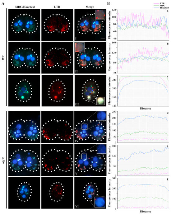 paMAC failed to acidify during PND in atg5i mutants. (A): Conjugating cells at 8 (I,IV), 10 (II,V), and 12 h (III,VI) were stained with MDC, LTR, and Hoechest in WT and atg5i cell lines. Dashed circle represents the cell outline of Tetrahymena. Scale, 20 μm; (B): The fluorescence intensities of the three probes were analyzed in the region of the selected nucleus (white box) in the merged diagram (left panel) with Image J (version:1.8.0, National Institutes of Health, Bethesda, MD, USA), corresponding to the a–f.