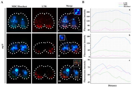 The acidification and degradation of meiotic products of MIC were delayed in atg5i cells. (A): Conjugating cells at 10 (I), 12 (II) and 24 h (III) were stained with MDC, LTR, and Hoechest in atg5i cell lines. The white arrows point to the acidifying meiotic products. Dashed circle represents the cell outline of Tetrahymena. scale, 20 μm; (B): The fluorescence intensities of the three probes were analyzed in the region of the selected nucleus (white box) in the merged diagram (left panel) with Image J, corresponding to the a–c.