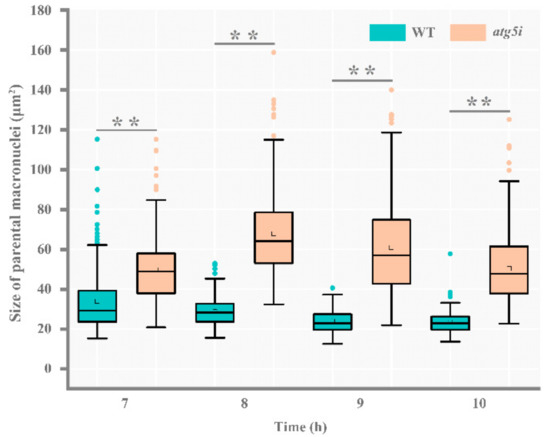 Condensation of paMAC was prevented after RNA interference of ATG5. Comparison of parental macronuclear size of mating WT cells and mating atg5i mutant cells at 7, 8, 9, and 10 h. Box plot explanation: upper horizontal line of box, 75th percentile; lower horizontal line of box, 25th percentile; horizontal bar within box, median; upper horizontal bar outside box, 90th percentile; lower horizontal bar outside box, 10th percentile. The green and orange circles represent the outliers of WT cells and atg5i mutant cells, respectively. n = 100 (cell number of pair cells). An unpaired sample t test was used for statistical analysis. ** p < 0.01.