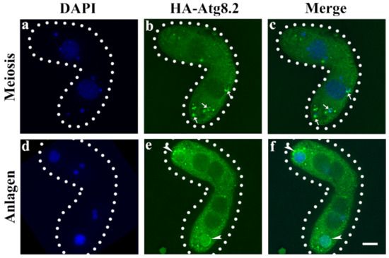 Localization of HA-Atg8.2 in the stage of meiosis and macronuclear anlagen. Cells collected at 5 h and 12 h after mixing were fixed and processed for immunofluorescence staining with anti-HA primary and FITC-conjugated secondary antibodies. Cellular nuclei were stained with DAPI to visualize DNA. (a,d), DAPI; (b,e), FITC; (c,f) Merge. The white arrows in (b) and (c) point to the meiosis products of MIC to be degraded, and the white arrows in (e,f) point to the paMAC to be degraded. Dashed circle represents the cell outline of Tetrahymena. Fluorescent images were taken with a DeltaVision deconvolution microscope. Scale bar, 10 μm.