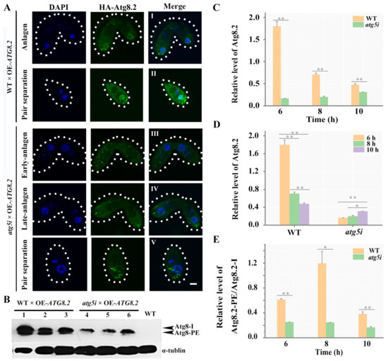 RNA interference of ATG5 decreased the expression and lipidation of Atg8.2 and hindered the localization of Atg8.2 on the paMAC. (A): WT and atg5i mutant paired cells during sexual reproduction were used to analyze the subcellular localization of Atg8.2. I, WT mating cells at the anlagen stage; II and V, WT cell and atg5i mutant cell at the pair separation stage; III, atg5i mating mutant cells at the early-anlagen stage.; IV, atg5i mating mutant cells at the late-anlagen stage. Fluorescent images were taken with a DeltaVision deconvolution microscope. Dashed circle represents the cell outline of Tetrahymena. Scale, 10 μm; (B): The expression of Atg8.2 was detected by Western blot in WT and atg5i mutant paired cells. Protein samples were prepared at 6 h (lanes 1 and 4), 8 h (lanes 2 and 5), and 10 h (lanes 3 and 6) after mixing different mating types of cells; (C–E): Gray intensity analysis of the Western blot results was performed with Image J software. The unpaired sample t test was used in C and E, and a paired sample t test was used in (D). * p < 0.05 and ** p < 0.01.