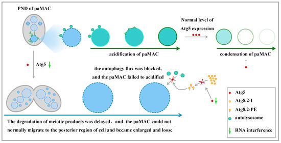 The paMAC migrates from the anterior or middle of the cytoplasm to the posterior region, condenses, gradually acidifies, and degrades during the PND of WT cells. By contrast, the paMAC enlarges, loosens, and fails to degrade in the atg5i mutants. The lipidation of Atg8.2 and its localization on the paMAC were inhibited after knocking down ATG5 (Figure 9). Therefore, Atg5 is involved in the regulation of the selective autophagy of paMAC. Atg5 is necessary for the expression and lipidation of Atg8, as well as the acidification and degradation of paMAC. Atg5 regulates the acidification and degradation of paMAC by mediating the lipidation of Atg8 in Tetrahymena.