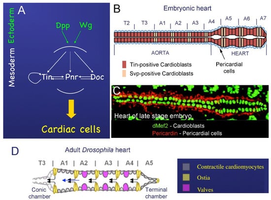- Bodmer, R. The Gene Tinman Is Required for Specification of the Heart and Visceral Muscles in Drosophila. Development 1993, 118, 719–729. [Google Scholar] [CrossRef] [PubMed]