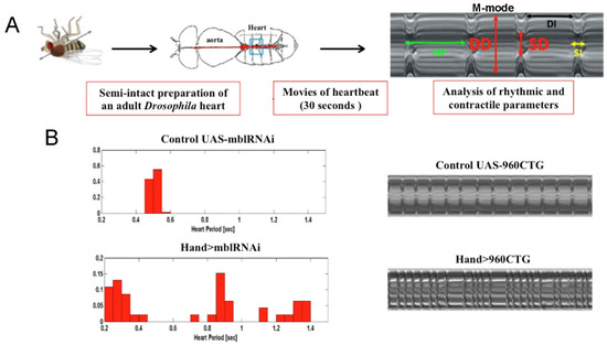 DM1 is caused by the expansion of unstable CTG triplet repeats in the 3′-untranslated region of the dystrophia myotonica protein kinase (DMPK) gene [65]. The Dmpk transcripts carrying expanded CUG triplets (more than 50 and up to several thousand) form toxic hairpin-like secondary structures in the nuclei that sequester RNA-binding proteins (RNBPs), and in particular Muscleblind-like 1 (MBNL1), leading to loss of its function [66,67]. In parallel, another RNBP, ELAV-like factor 1 (CELF1), becomes stabilized [68]. MBNL1 and CELF1 regulate the alternative splicing of common targets involved in skeletal and cardiac muscle function, and their misbalance causes splicing defects responsible for DM1 symptoms [69]. Cardiac dysfunctions appear in 80% of DM1 patients, generally several years after the onset of neuromuscular symptoms, but in some cases, cardiac disease may be the first manifestation in DM1. Among cardiac defects, DM1 patients present an increased risk of mechanical diastolic and/or systolic dysfunction, cardiomyopathy, conduction disturbances and arrhythmias [70], but the most common DM1 cardiac defect is conduction disturbances with lengthened PR interval (corresponding to the time between atrial depolarization and ventricular depolarization) and intraventricular conduction delay [71,72]. To identify gene deregulations caused by toxic repeats and underlying DM1 pathogenesis, several animal models were generated [65,66]. Importantly, Drosophila DM1 models [73,74] have reproduced all the cardiac defects observed in DM1 patients, with the analysis of phenotypes facilitated by semi-automated optical heartbeat analysis (SOHA) [75]. Briefly, this technique allows the analysis and quantification of rhythmicity and the dynamics of the heart contractions, including the relaxation phase (DI, diastolic interval), contraction phase (SI, systolic interval), heart period (HP), arrhythmia index (AI), end systolic diameter (ESD), end diastolic diameter (EDD), and the percentage of fractional shortening (Figure 2A).
