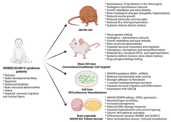 Although the WWOX protein can be found in many tissues, it is highly expressed in the brain, with variable expression during different stages of embryogenesis and postpartum maturation [3,8,23,24]. This has led to a working hypothesis that WWOX has a central role in CNS development and homeostasis and, by extension, that its loss can lead to neurological disorders. This review aims to discuss the different models made available through the years to study WWOX-related developmental and epileptic disorders and possible treatment avenues that became reachable through these models. It is, however, crucial to understand that WWOX has been associated with many other disorders such as autism-spectrum disorders (ASD), Alzheimer’s disease (AD), Parkinson’s disease (PD), and multiple sclerosis (MS), the models of which will be briefly reviewed.
