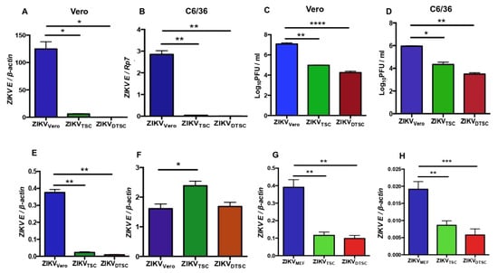 To test the infectivity of ZIKV in TSCs and DTSCs, we infected TSCs and DTSCs with ZIKV and collected the cell media; ZIKVs propagated in these cells were named ZIKVTSC and ZIKVDTSC, respectively. For comparative analysis, Vero cells were also infected with ZIKV under the same condition, and the produced viruses were named ZIKVVero. ZIKVVero developed plaques between 4–6 days in a plaque-forming assay, whereas it took 7–10 days for ZIKVTSC and ZIKVDTSC to form plaques, indicating weak infectivity of the viruses derived from TSCs and DTSCs. The infectivity of these viruses was further examined by infecting Vero cells with a reverse-transcription quantitative PCR (qPCR) assay. The results showed that the replication of ZIKVTSC and ZIKVDTSC was approximately 20-fold and 100-fold lower than ZIKVVero at 24 h post-infection (p.i.), respectively (Figure 1A). As ZIKV is primarily transmitted by mosquitoes, we also assessed the infectivity of ZIKVTSC and ZIKVDTSC in mosquito C6/36 cells. Similarly, we found that the infectivity of ZIKVTSC and ZIKVDTSC was also significantly decreased compared to ZIKVVero in C6/36 cells (Figure 1B). To confirm these qPCR results, we performed a plaque-forming assay to measure the viral titers in the cell culture media. Consistently, the results showed that ZIKVTSC and ZIKVDTSC decreased by approximately 100-fold the infectious viral particles in both Vero and C6/36 cell cultures (Figure 1C,D). To test if the reduced infectivity of ZIKVTSC and ZIKVDTSC may be due to reduced attachment to the host cells, we incubated Vero cells with 1 MOI of ZIKV propagated in different cells at 4 °C for 1 h. At this temperature, viruses can attach to the cells but cannot enter inside. After incubation, the cells were washed with cold PBS to remove unbounded viruses, and the attached viruses were quantified by qPCR. In comparison to ZIKVVero, the attachment of ZIKVTSC and ZIKVDTSC was significantly lower (Figure 1E). Interestingly, ZIKVTSC and ZIKVDTSC can regain their lost infectivity after re-propagation in Vero cells for one additional passage (Figure 1F). These results suggest that ZIKV generated in TSCs and DTSCs has lower attachment and infectivity, which may result from the different enzymatic machinery in the host cells. To exclude the possibility that this phenomenon is due to the origin of the Vero cells (African Green Monkey), we compared the infectivity of ZIKVTSC and ZIKVDTSC with ZIKV generated in mouse embryonic fibroblasts (MEFs). The results of viral RNA replication and the attachment assay also indicated that ZIKV-propagated TSCs and DTSCs displayed reduced viral replication (Figure 1G) and attachment (Figure 1H). We next tested if this phenomenon is only limited to ZIKV. For this, we propagated WNV (another flavivirus) and CHIKV (an alphavirus) in TSCs, DTSCs, or Vero cells. Similarly, our results demonstrated that both CHIKV (Figure 2A) and WNV (Figure 2B) propagated in TSCs and DTSCs exhibited attenuated replication (Figure 2A,B) and attachment to the host cells (Figure 2C,D) when compared to the viruses generated in Vero cells. These results collectively demonstrate that ZIKV, WNV, and CHIKV propagated in TSCs and DTSCs exhibit reduced infectivity in vitro, suggesting that an intrinsic deficiency in these stem cells and their differentiated cells may attenuate these viruses.