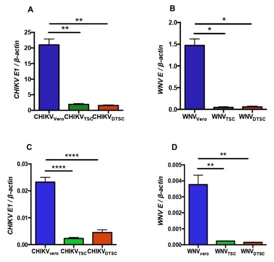 CHIKV and WNV generated in TSCs, and DTSCs decrease infectivity in vitro. Vero cells were infected with 1 MOI of CHIKV (A) or WNV (B) that was generated in Vero, TSCs, or DTSCs. At 24 h p.i., the ratio of CHIKV-E1 or WNV E to cellular β-actin was determined by qPCR. Vero cells were inoculated with 1 MOI of CHIKV (C) and WNV (D) grown in the different cells and incubated at 4 °C for 1 h. After washes, the attached viruses were quantified with qPCR. The results were analyzed by using a two-tailed Student’s t-test and are representative of at least two independent experiments and expressed as mean ± SEM. *, **, and **** denote p < 0.05, p < 0.01, and p < 0.0001, respectively.