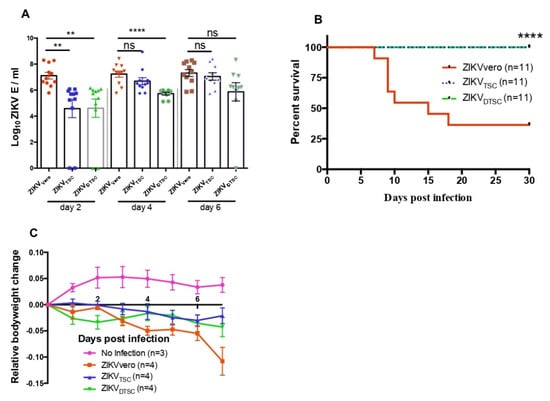 ZIKVTSC and ZIKVDTSC exhibit attenuated infectivity in Ifnar1−/− mice. Four-week-old Ifnar1−/− mice were infected with 1 × 104 PFU of ZIKVVero, ZIKVTSC, or ZIKVDTSC via footpad. (A) The ZIKV genome copies were quantified by measuring ZIKV with qPCR and expressed as log10 (PFU/mL). (B) The survival curves of Ifnar1−/− mice infected with the different strains of ZIKV. (C) Relative bodyweight changes of the mice compared to the weight before infection (Day 0). The data were analyzed by a two-tailed Student t-test (A) or log-rank test (B). ** and **** denote p < 0.01, and p < 0.0001, respectively.
