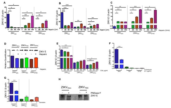 ZIKV grown in TSCs and DTSCs has reduced glycosylation. (A) Vero cells were pre-treated with heparin at different concentrations for 1 h, then 1 MOI of ZIKVVero, ZIKVTSC, or ZIKVDTSC, and incubated at 4 °C for 1 h. After washes, the attached viruses were quantified with qPCR. (B) Vero cells were pre-treated with heparin at different concentrations for 1 h, then inoculated with 1 MOI of ZIKVVero, ZIKVTSC, or ZIKVDTSC and incubated at 37 °C for 24 h, and the ratio of ZIKV to cellular β-actin was determined by qPCR. (C) ZIKVVero, ZIKVTSC, or ZIKVDTSC were pre-incubated with heparin at 37 °C for 1 h. Then, the mixture of the virus and heparin was added to Vero cell culture (1 MOI) and kept at 4 °C for 1 h, and the cell-attached viruses were quantified by qPCR. (D) ZIKVVero, ZIKVTSC, and ZIKVDTSC (1 × 105 PFU) were mixed with heparin-conjugated sepharose beads or unconjugated sepharose beads as control and kept at 4 °C for 1 h. After washing, viruses bound to the beads were lysed and analyzed for ZIKV E by an immunoblotting assay (upper panel). The relative quantification of the blots is expressed in bar graphs in the lower panel. (E) Vero cells were pre-treated with different concentrations of chondroitin sulfate A (CSA) for 1 h and incubated with 1 MOI of ZIKVVero, ZIKVTSC, or ZIKVDTSC at 4 °C for 1 h. After washes, the attached viruses were quantified with qPCR. (F) Vero cells, TSCs, and DTSCs were infected with ZIKV (1 MOI) in the presence or absence of tunicamycin. On 24 h p.i., the viral replication was quantified by measuring the ratio of ZIKV E to cellular β-actin with qPCR. (G) Vero cells were incubated with 1 MOI of ZIKVVero, ZIKVTSC, or ZIKVDTSC in the presence or absence of genistein at 4 °C for 1 h. After washes, the attached viruses were quantified with qPCR. (H) The stocks of ZIKVVero, ZIKVTSC, and ZIKVDTSC were pelleted by ultracentrifugation. The viruses were treated with PNGase F for deglycosylation and then analyzed with immunoblotting for ZIKV. The results were analyzed by either one-way ANOVA followed by Tukey’s test (A–C,E) or a two-tailed Student’s t-test (F,G). The results are representative of at least two independent experiments and are expressed as mean ± SEM. *, **, ***, and **** denote p < 0.05, p < 0.01, p < 0.001, and p < 0.0001, respectively.