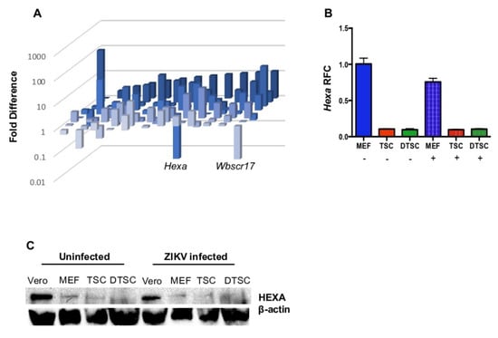 To pin down which gene may be related to the deficiency in glycosylation in TSCs and DTSCs, we screened the expression of mouse glycosylation-related genes with a qPCR array. The array analysis showed that Hexa expression was downregulated 58-fold in TSCs compared to the MEF control cells (Figure 5A). To confirm this result, we infected the MEFs, TSCs, and DTSCs with ZIKV (1 MOI) or PBS as control and analyzed Hexa expression by qPCR. The results confirmed that the expression of Hexa in TSCs and DTSCs decreased 44- and 55-fold, respectively, compared to that in MEF cells at 24 h of infection (Figure 5B). In addition, there was the same trend of reduction of HEXA in TSCs and DTSCs as in Vero and MEF cells at the protein level in an immunoblotting analysis (Figure 5C). These results indicate that HEXA may contribute to the glycosylation of viral glycoproteins when the viruses replicate in the host cells.