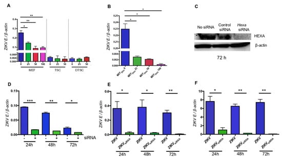 Vero cells transfected with Hexa siRNA were infected with 1 MOI of ZIKV. After 24 h, the cells were collected and lysed in Laemmli sample buffer (Alfa Aesar, Haverhill, MA, USA). The proteins were then separated by 10% SDS-polyacrylamide gel electrophoresis and transferred to a nitrocellulose membrane (Bio-Rad) and blocked for 1 h with 5% bovine serum albumin at RT. After treating with mouse-specific Rabbit primary antibody (HEXA, Abcam, Boston, MA, USA) in the ratio 1:1000 at 4 °C overnight on a rocker, the membrane was washed with TBS-T. Horseradish peroxidase-conjugated secondary antibody (Goat polyclonal Ab to Rabbit IgG, Abcam; 1:5000) was added for 1 h at RT; the membrane was washed with TBS-T and developed using SuperSignal West Pico Chemiluminiscence Substrate (Thermo Scientific, Waltham, MA, USA) for acquiring the images using a ChemiDoc MP system (Bio-Rad).