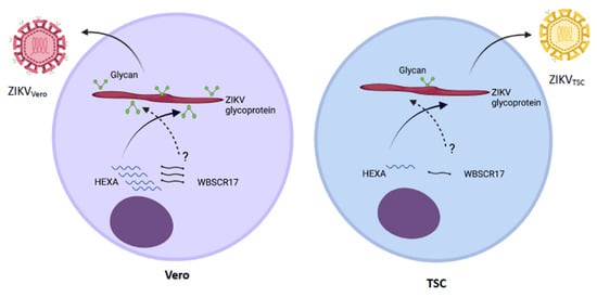 Schematic illustration of the mechanism of HEXA-mediated glycosylation of ZIKV proteins. Vero cells produce HEXA and possibly WBSCR17 during ZIKV replication, which facilitate the glycosylation of ZIKV E and other glycoproteins. In contrast, TSCs and DTSCs have a reduced level of HEXA during ZIKV replication, resulting in less glycosylation of ZIKV E proteins, which attenuates ZIKV binding to GAG receptors. Created with Biorender.com.