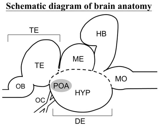 A schematic diagram showing the lateral view of a black porgy brain. DE, diencephalon; HB, hindbrain; HYP, hypothalamus; ME, mesencephalon; MO, medulla oblongata; OB, olfactory bulb; OC, optic chiasm; POA, preoptic area; and TE, telencephalon.