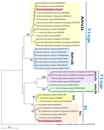 A neighbor-joining (NJ) phylogenetic tree of neurohypophysial hormone receptor amino acids. The phylogenetic tree was constructed based on the alignment of 38 partial amino acid sequences of Avtr and Itr from selected fishes using the neighbor-joining method with pairwise deletion and 1000 bootstrap replicates. The number shown at each branch node indicates the bootstrap value (%); only values and branching above 50% are shown. This tree was rooted using the sequence of octopressin receptor from an octopus and shows major branches of two V1-type receptors (Avtrv1a and Avtrv1b), two V2-type receptors (Avtrv2a and Avtrv2b), and two It receptors (Itr1 and Itr2). The cloned sequences from black porgy were grouped into Avtrv1a and Itr1, and are illustrated. Scientific names of fishes and GenBank accession numbers of sequences are shown in figure.