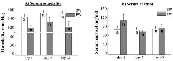 The serum osmolality levels were significantly decreased on day 1 and 30 in the FW fish compared to the SW control (Figure 3A). The osmolality was not statistically different between SW and FW (Figure 3A). The serum cortisol levels were significantly increased in the FW fish on day 1 compared to the SW control (Figure 3B); there were no differences in serum cortisol levels on day 7 and day 30 in the FW fish compared to the SW control (Figure 3B).