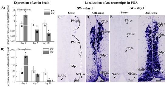 Q-PCR was performed to analyze the transcripts of avt in the telencephalon (A) and diencephalon (B) of SW and FW black porgies on day 1, day 7, and day 30 (n = 8 in each group). Gene expression was normalized to the control (gapdh) gene. The results are expressed as mean ± SEM. Different letters indicate a significant difference between sampling points with the same treatment; asterisks (*) show differences between groups at the same time point (two-way ANOVA followed by Tukey’s test, p < 0.05). (C–F) Localization of avt transcripts in SW and FW black porgies’ preoptic areas (POA) on day 1 (n = 4 in each group). The transcripts of avt (D,F) were detected in both SW and FW fish. Furthermore, the avt transcripts were increased in PMmc and PMpc of the FW fish (F) compared to the SW fish (D). No difference was found between SW (D) and FW (F) fish in PMgc on day 1. One of the representative fish from each group was used for the histological data. There were no signals detected in the SW (C) and FW (E) fish when using the respective control sense probes of avt on day 1. PMgc: preopticus parvocellularis of pars gigantocellularis; PMmc: preopticus parvocellularis of pars magnocellularis; PMpc: preopticus parvocellularis of pars parvocellularis; NAPv: nucleus anterioris periventricularis; and NPOav: anteroventralis nucleus preopticus.
