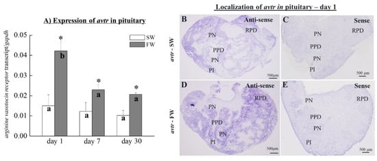 The transcripts of avtr were detected in the pituitary (Figure 5A). The avtr transcripts were significantly increased on days 1, 7, and 30 in the pituitary of the FW fish when compared to the SW controls (increased by 4.2-fold, 2.2-fold, and 1.8-fold on days 1, 7, and 30, respectively; Figure 5A). Among the FW fish groups, the avtr mRNA was significantly decreased on day 7 and day 30 compared to the FW fish on day 1 (Figure 5A).