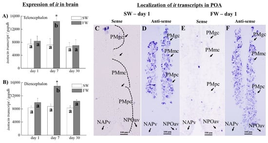 Transcripts of it (Figure 6D,F) were detected in the preoptic areas of the SW and FW black porgies on day 1 (Figure 6D,F). There were no differences in the intensity of it transcripts in the PMgc and PMmc, but they slightly increased in the PMpc of the FW fish on day 1 (Figure 6F) compared to the PMpc of the SW fish (Figure 6D). There were no signals in the SW and FW fish when using the it control sense probes on day 1 (Figure 6C,E).