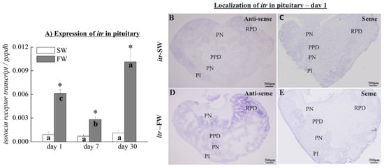(A) Q-PCR analyzed the transcripts of itr (A) in the pituitary glands of SW and FW black porgies on day 1, day 7, and day 30 (n = 8, in each group). Gene expression was normalized to the control (gapdh) gene. The results are expressed as mean ± SEM. Different letters indicate a significant difference between sampling points with the same treatment; asterisks (*) show differences between groups at the same time point (two-way ANOVA followed by Tukey’s test, p < 0.05). (B–E) The localization study of itr transcripts (n = 4 in each group; revealed them in the pituitary glands of the SW (B) and FW (D) black porgies on day 1. There were no signals detected in the SW and FW fish when using the respective control sense probes of itr on day 1 (C,E). RPD: rostral pars distalis; PPD: proximal pars distalis; aNH: anterior neurohypophysis; pNH: posterior neurohypophysis.