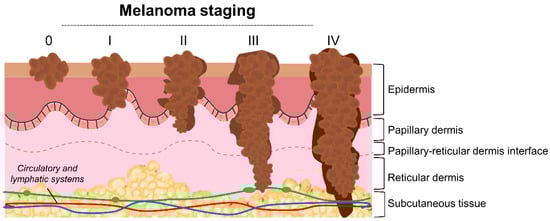 Classically, melanoma progression has been represented by the Clark model, a previously widely accepted method for melanoma microstaging, based on the anatomic level of local invasion [,,]. Nowadays, the staging of melanoma considers several parameters, including the Breslow depth, ulceration, extent of regional lymph node invasion, and degree of spreading in the surrounding area and distant parts of the body [,,,]. As represented in Figure 1, the American Joint Committee on Cancer (AJCC) has defined the TNM system—tumor, lymph nodes, metastasis—for melanoma staging, being internationally recognized and commonly applied [,]. Briefly, in the TNM system: (i) T refers to the size of the primary tumor and its spread to adjacent tissues; (ii) N describes the number of regional lymph nodes affected by the tumor; and (iii) M identifies the presence of metastasis. At stage 0, abnormal melanocytes are observed in the epidermis, being designated as melanoma in situ. At stages I and II, localized cancer has formed. At stage III, cancer has spread to nearby lymph nodes, and at stage IV melanoma has spread to other tissues/organs, namely the lungs, liver, brain, spinal cord, bone, soft tissue, gastrointestinal tract, and distant lymph nodes.