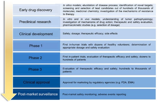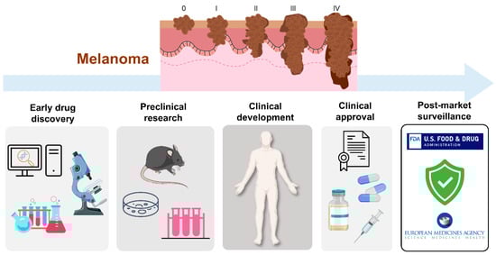 Although a panoply of therapeutic strategies is available for melanoma, an ideal drug has not yet been found. While early-stage melanoma can often be treated by surgical excision, metastatic melanoma, which is associated with high aggressiveness and low survival rates, remains untreated in most cases. In this sense, new therapies are needed. In general, prior to becoming available for commercialization, new drugs must pass through several steps, namely discovery and development, preclinical studies, clinical trials and review by regulatory entities [,,]. Research and discovery of new antimelanoma molecules may start by preliminary selection of the most promising lead compounds through computational approaches (in silico) [,]. This strategy is usually followed by in vitro testing of hit compounds, selection of the most promising for further in vivo studies and, ultimately, clinical trials, as described in Figure 2 []. Taking into consideration that a drug discovery and development program lasts 1–2 decades and costs around $3 billion, it is disappointing that around 60% of new anti-cancer agents fail in advanced randomized controlled trials. In addition, the success rate from first-in-human to registration in oncology field is approximately 5%, being much lower when compared to other pathologies []. For this reason, the establishment of more accurate and reliable methodologies to be used at early drug discovery and preclinical research represents an important strategy for a successful selection of potential compounds. This ultimately reduces the associated costs and attrition rates that occur at clinical development phases. In the following sections, the in silico, in vitro, and in vivo assays used for the discovery/development of new drugs towards melanoma will be addressed.