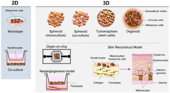 Schematic representation of the main in vitro models used for melanoma research. Part of the figure was drawn by using pictures from Servier Medical Art. Servier Medical Art by Servier is licensed under a Creative Commons Attribution 3.0 Unported License (https://creativecommons.org/licenses/by/3.0/ (accessed on 25 June 2021)).