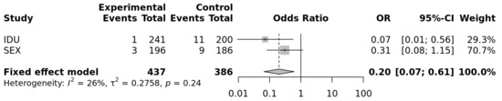 Forrest plot of meta-analysis of the sexual and IDU populations: OR and 95% Confidence interval and fixed-effect meta-analysis. p = 0.0044 for a recessive model of the protective allele (https://metagenyo.genyo.es/ (accessed on 13 June 2021)).