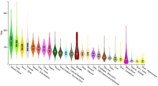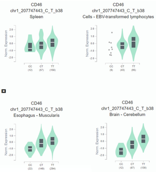 The role of the rs2796265 polymorphism in the expression of the CD46 gene was investigated through the GTEx portal (ReleaseV7; https://www.gtexportal.org (accessed on 19 June 2021)). CD46 mRNA is ubiquitously expressed in human tissues (Figure 2).
