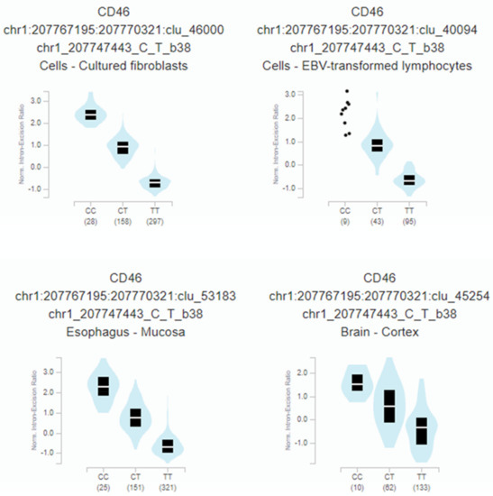 Levels of mRNA expression according to CD46 rs2796265 genotypes were calculated using the GTEx portal (https://gtexportal.org/home/snp/rs2796265 (accessed on 19 June 2021)) Analysis Release V8 (dbGaP Accession phs000424.v8.p2) [13]. This portal allows testing of associations between SNPs and expression quantitative trait loci (eQTL) and splicing quantitative trait loci (sQTL) [44].
