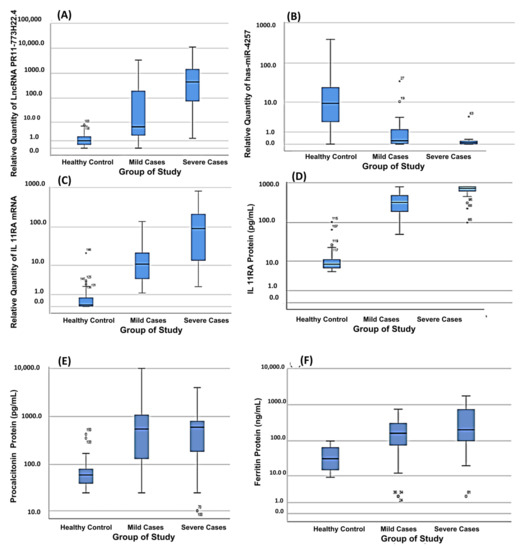 The differential box plot analysis of the investigated biomarkers, measured by qRT-PCR or ELISA, among the study groups. (A) LncRNA RP11-773H22.4, (B) HSA-MIR-4257, (C) IL11RA mRNA, (D) IL11RA protein, (E) pro-calcitonine and (F) ferritin. The median is represented as a line inside the box, and the 1st and 3rd quartiles are represented by the top and bottom lines of the box, respectively. Dots represent outliers.