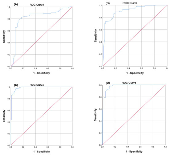 Moreover, by assessing the serum levels of ferritin, procalcitonin (ENSGOOOOO110680) and IL11RA proteins (ENST00000441545.7) in the studied groups, we found significant increases in the three proteins in the COVID-19 group compared to the healthy control group (p < 0.000) (Table 2, Figure 1D–F). These increases in the IL11RA, ferritin and procalcitonin are in agreement with other findings, as ferritin and procalcitonin have been used as prognostic biomarkers for determining disease severity [39,40,41]. However, based on the obtained results, procalcitonin cannot discriminate among mild and severe cases.