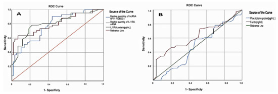 The receiver operator characteristic (ROC) curve presents the diagnostic accuracy of the IL11RA mRNA panel discriminating between mild and severe cases of SARS-CoV-2: (A) IL11RA mRNA and protein, and LncRNA RP11-773H22.4. (B) Procalcitonin and ferritin.