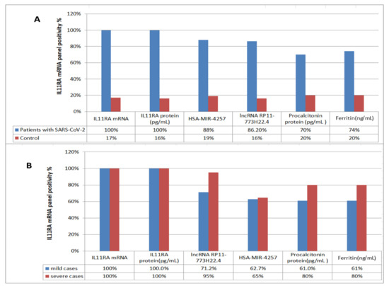 The above two ROC curve analyses (RNA level and protein level) show that the IL11RA mRNA and its protein have the best cutoff values and AUCs for discriminating between mild and severe cases of SARS-COV-2 (Figure 3). Moreover, lncRNA RP11-773H22.4 and hsa-miR-4257 showed better sensitivities (86.2% and 88%) than ferritin and procalcitonin (74% and 70%, respectively). These results suggest that the selected RNA panel could be used as a tool to differentiate mild from severe COVID-positive cases.