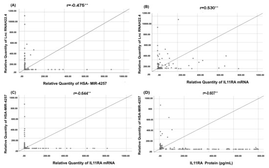 Correlations among IL11RA molecular network and IL11RA protein. As shown each two parameters are correlated together (A) the relative quantity of has-miR-4257 and Ln RNA H22.4, showing increase in the Long nc RNA compared to the miRNA negative correlation, (B) The correlation between the IL-11R mRNA and the Lnc RNA H22.4, showing that positive correlation between the two variables, (C) The correlation between the IL-11R mRNA and has-miR-4257, showing negative correlation and finally (D) the correlation between IL 11RA protein and the has-miR-4257, which shows negative correlation and so as the IL-11RA increase the has-miR-4257 decrease. ** are Statistically significant.
