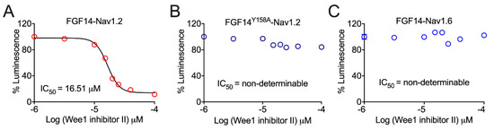 Based upon the Y158 residue of FGF14 (FGF14Y158) serving as a prominent site for phosphorylation-mediated regulation of the protein [14], we next investigated if Wee1 kinase might exert its regulatory effects on FGF14:Nav1.2 complex assembly through a mechanism dependent upon the presence of the residue. When tested for its effects on FGF14:Nav1.2 complex assembly in conditions in which FGF14WT was mutated to FGF14Y158A, Wee1 inhibitor II, even at the highest concentration tested (i.e., 150 µM), failed to reduce the luminescent signal by greater than 20% compared to per plate control wells treated with 0.5% DMSO (Figure 1B). These findings, in stark contrast to those observed in the WT condition where high concentrations of Wee1 inhibitor II conferred changes in the luminescent signal of greater than or equal to 80% (Figure 1A), provide strong evidence that the mechanism of action of pharmacological inhibition of Wee1 kinase as it relates to regulating FGF14:Nav1.2 complex assembly is dependent upon the presence of FGF14Y158.