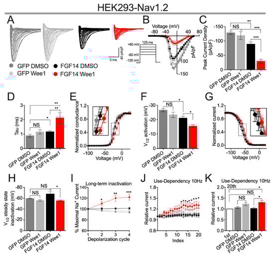 Having shown that pharmacological inhibition of Wee1 kinase confers modulatory effects on FGF14:Nav1.2 complex assembly (Figure 1A), we next sought to investigate if these alterations in complex assembly resulted in changes in the function of the Nav1.2 channel. To do so, HEK293 cells stably expressing the Nav1.2 channel (HEK-Nav1.2) [26,29,30] were transiently transfected with either GFP (HEK-Nav1.2-GFP) or FGF14-GFP (HEK-Nav1.2-FGF14-GFP). Cells were then incubated for 30 min with either vehicle (0.1% DMSO) or 15 µM of Wee1 inhibitor II, a concentration selected on the basis of it being close to the IC50 value of the compound as determined in the LCA (Figure 1A). After incubation, whole-cell voltage-clamp recordings were performed to characterize the effects of pharmacological inhibition of Wee1 kinase on the activity of Nav1.2 channels (Figure 2; Table 1 and Table 2).