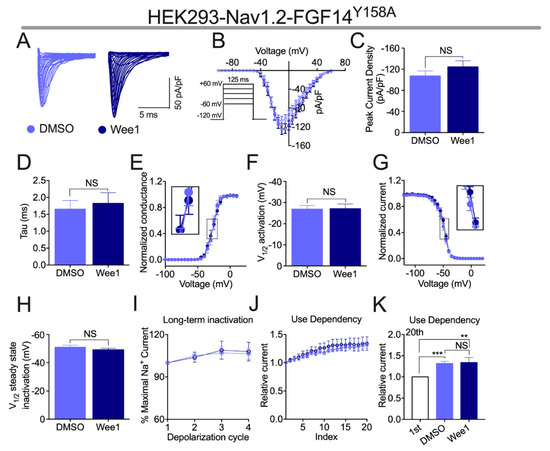 Previously, we showed that through phosphoryation of FGF14Y158, the tyrosine kinase JAK2 modulates FGF14-mediated regulation of Nav channel activity [14]. As Wee1 is also a tyrosine kinase, and given the robust modulatory effects of pharmacological inhibition of Wee1 on FGF14-mediated regulation of the Nav1.2 channel shown in Figure 2, we next investigated if FGF14Y158 was also necessary for Wee1 inhibitor II to exert its regulatory effects on FGF14 activity. To that end, HEK-Nav1.2 cells were transiently transfected with FGF14Y158A-GFP (HEK-Nav1.2-FGF14Y158A-GFP), and the effects of Wee1 inhibitor II on currents mediated by these cells were assessed using the voltage-clamp protocols employed in Figure 2.