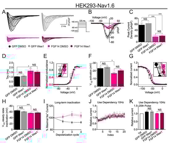 As also observed in previous studies [14,30], co-expression of FGF14 with the Nav1.6 channel in heterologous cells resulted in a reduction in the fraction of Nav1.6 channels entering into long-term inactivation (Figure 4I). This is evidenced by the INa ratio (normalized to the INa amplitude during the first depolarization) of 2nd, 3rd, and 4th depolarization cycles being greater in HEK-Nav1.6-FGF14-GFP cells compared to HEK-Nav1.6-GFP cells (Figure 4I; Table 4). However, Wee1 inhibitor II did not affect the entry of Nav1.6 channels into long-term inactivation in the absence or presence of FGF14 (Figure 4I; Table 4). Similarly, pharmacological inhibition of Wee1 kinase did not affect the cumulative inactivation of Nav1.6 channels in the absence or presence of FGF14 (Figure 4J,K).
