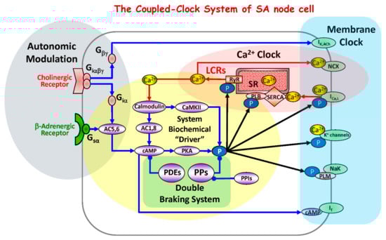 In summary, the combined effects of PP inhibition are to increase basal phosphorylation of both SR proteins (PLB, RyR) and the surface membrane proteins (ICaL, IK) that modulate the basal state clock coupling and the spontaneous AP firing rate. The main functional effects of phosphorylation on both M and Ca2+ clock proteins is an increase in the size and an earlier occurrence of spontaneous RyR-generated LCRs (i.e., ensemble Ca2+ signal beneath the surface membrane) during diastolic depolarization, which shifts the acceleration of diastolic depolarization to earlier times, leading to a reduction in the AP cycle length []. The reduction in the LCR period, regulated by the entrainment of coupled-clock functions, predicts the reduction in AP cycle length (for a review see [,].Thus, basal PP activities reduce the extent to which clock molecules are phosphorylated in the basal state, suppressing the basal AP firing rate; basal PP activity, and basal PDE activity [] act in concert to prevent excessive basal cAMP activation of PKA and CaMKII protein kinase activity, thereby limiting excessive basal phosphorylation of molecules that maintain cell Ca2+ homeostasis. The net result maintains the basal AP firing rate well below its maximum, enabling rapid, robust responses to external input aimed at affecting the AP firing rate. In other words, PP and PDE activities comprise a “double braking system” (Figure 1) on the feed-forward signaling of Ca2+-cAMP-PKA signaling that drives the SANC pacemaker function: PDEs are the “front brakes” and phosphatases are the “rear brakes” of the coupled-clock. In response to β-adrenergic stimulation, this “double breaking system” becomes partially overpowered, enabling cAMP and clock protein phosphorylation levels to increase. However, an increase in PKA-dependent phosphorylation further elevate PDE [] and likely PP activities providing powerful negative feedback for cAMP signals and preventing excessive increases in cAMP and protein phosphorylation to limit the magnitude of the functional response to β -adrenergic receptor stimulation.