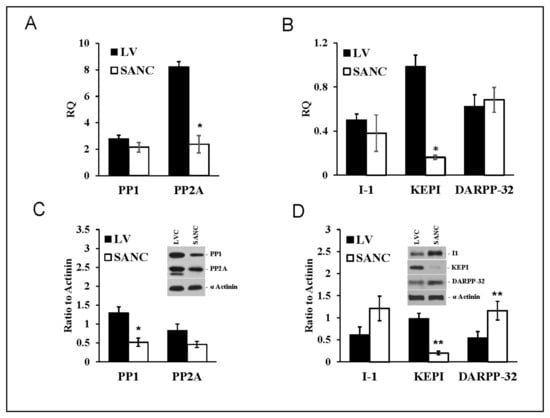 mRNA expression (A,B) and protein abundance (C,D) (Mean+/−SEM) patterns of PP1, PP2A, and PP1 endogenous inhibitors (I-1, KEPI and DARPP-32) normalized to β-tubulin (mRNA) or α-actinin in LVC and SANC (n = 6 independent hearts analyzed per group); * p < 0.05, ** p < 0.01 compared to LVC. For alternative transcript names see Table S1. For Primers and probes used for RT-QPCR see Table S2.