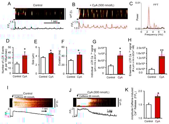 (A,B) Representative confocal line-scan images and (C) a fast Fourier transform (FFT) of Ca2+ oscillations in a permeabilized SANC bathed in 150 nmol/L [Ca2+] in control conditions and during superfusion with 500 nmol/L CyA. (D–H) Average changes in local Ca2+ release characteristics (LCRs) in control and during superfusion with 500 nmol/L CyA (n = 6): (D) Number of LCR events per 100 µm of the line-scan image and during a 1-sec time interval; (E) LCR size (as FWHM, the full width at half-maximum amplitude); (F) LCR duration (as FDHM, the full duration at half-maximum amplitude); (G) Ca2+ signals of Individual LCRs (µmxmsxΔCa2+ nmol/L); (H) Ca2+ signals of the LCR ensemble (the integrated Ca2+ signal of all LCRs), * p < 0.05, ** p < 0.01 paired t-test vs control, n = 6. Representative confocal images (I,J) and the average amplitude of the SR Ca2+ release (K) induced by a rapid spritz application of 20 mM caffeine in permeabilized SANC during 500 nmol/L CyA superfusion (n = 12) and in control (n = 7). * p < 0.05, 2-tailed t-test.
