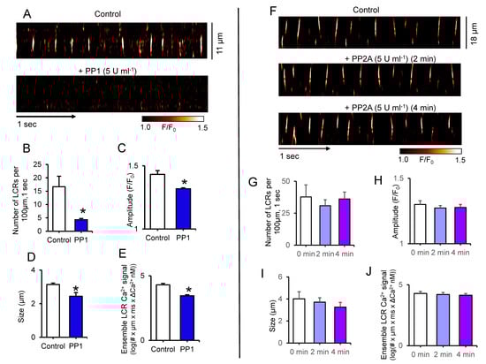 Representative confocal line-scan images of LCRs in permeabilized SANC bathed in 150 nmol/L [Ca2+] in control conditions and during incubation with purified PP1 (5 U mL−1) (A) or PP2A (5 U mL−1) catalytic subunits (F). Changes in local Ca2+ release (LCRs) characteristics before and during exposure to PP1 (n = 4) (B–E) or PP2A (n = 6) (G–J); (B,G) Number of LCR events per 100 µm of the line-scan image and during a 1-sec time interval; (C,H) LCR amplitude (F/F0); (D,I) LCR size (as FWHM, the full width at half-maximum amplitude); (E,J) Average ensemble of LCR Ca2+ signals (as log of the integrated Ca2+ signal produced by each LCR; #-represents number of LCR events). * p < 0.05, the paired t-test vs. control (B–E); one way ANOVA (G–J).