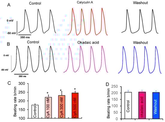 - duBell, W.H.; Gigena, M.S.; Guatimosim, S.; Long, X.; Lederer, W.J.; Rogers, T.B. Effects of PP1/PP2A inhibitor calyculin A on the E-C coupling cascade in murine ventricular myocytes. Am. J. Physiol. Heart Circ. Physiol. 2002, 282, H38–H48. [Google Scholar] [CrossRef] [PubMed]