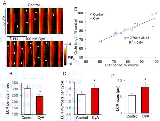 PP inhibition by CyA increases the LCR number and size of LCRs in SANC during spontaneous AP firing. (A) Confocal line-scan image of a representative SANC prior to and during exposure to 100 nmol/L CyA; CyA-induced changes in: (B) LCR period; (C) LCR number per cycle; (D) LCR size (n = 12). (E) PP inhibition-induced changes in the LCR periods predict the concurrent changes in the AP cycle lengths (n = 12). * p < 0.05 vs. control.